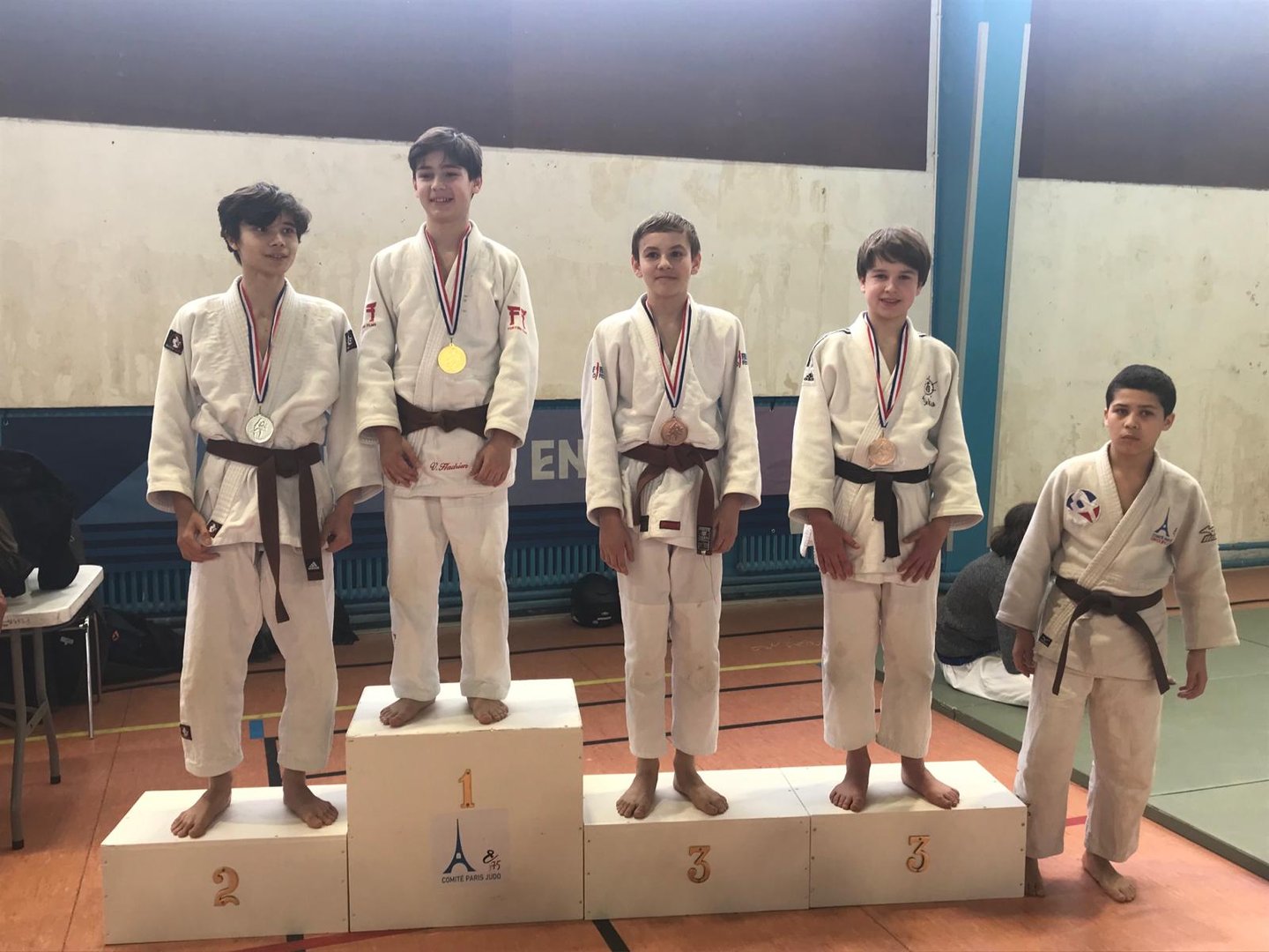 Les premiers sur le pont étaient les Cadets 2D (avec une pesée à 8h du matin !!) pour une fois localisés au Centre Sportif Elizabeth (Paris 14è, belle structure, mais vieux tapis 😁):